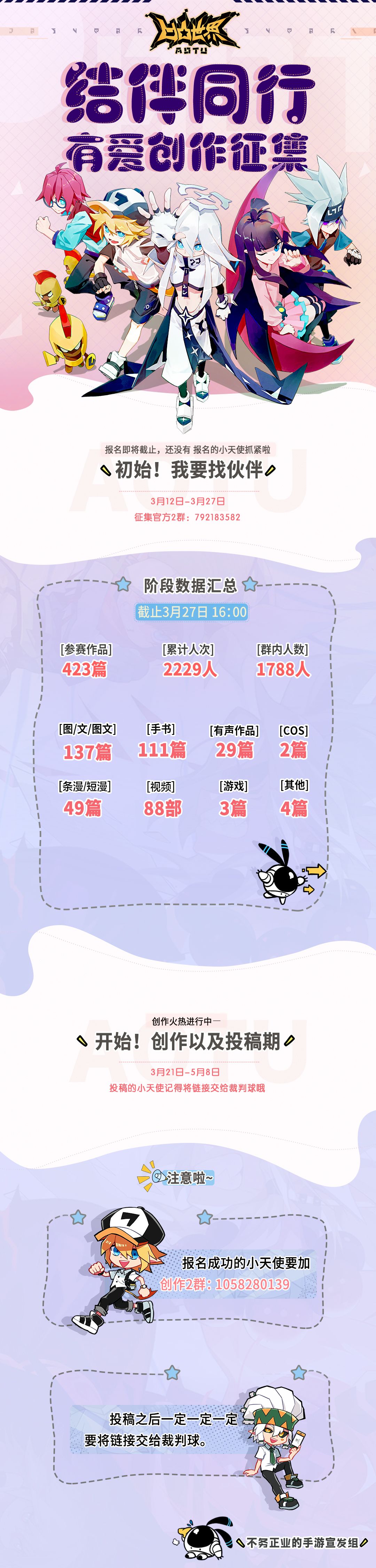 各位天使好,感谢大家积极参加“结伴同行有爱征集”活动!截止3月27日16点,裁判球一共收到天使们423个创作立项,累计2229人次参与。今晚24点,结伴阶段就要结束了。第一阶段结束后,将无法报名参与活动,还没报名的小天使抓紧了!完成报名的记得加创作群,2群:1058280139。
