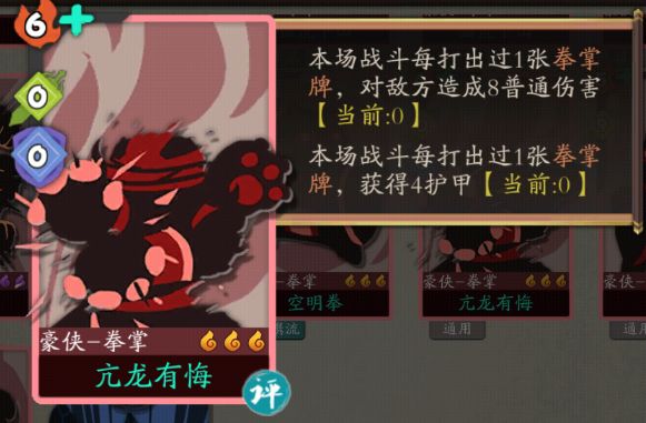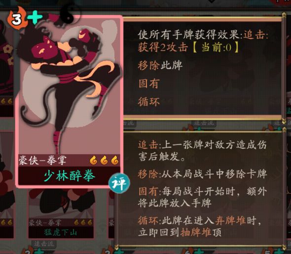 少林醉拳:第一回合使用,所有手牌获得追击加攻击效果空明拳:1张,第一回合使用,使所有拳掌牌获得“连携”效果