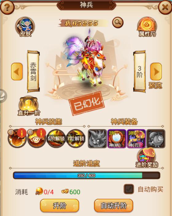 这个就是进阶的界面了,升阶需要消耗银两和神兵进阶丹。银两和神兵进阶丹获取的途径有很多,具体可以查看对应的攻略,然后点击升阶或者自动升阶都可以,自动升阶就不用一直点击了,系统会自动升阶到下一阶或者到升阶丹数量不足。
