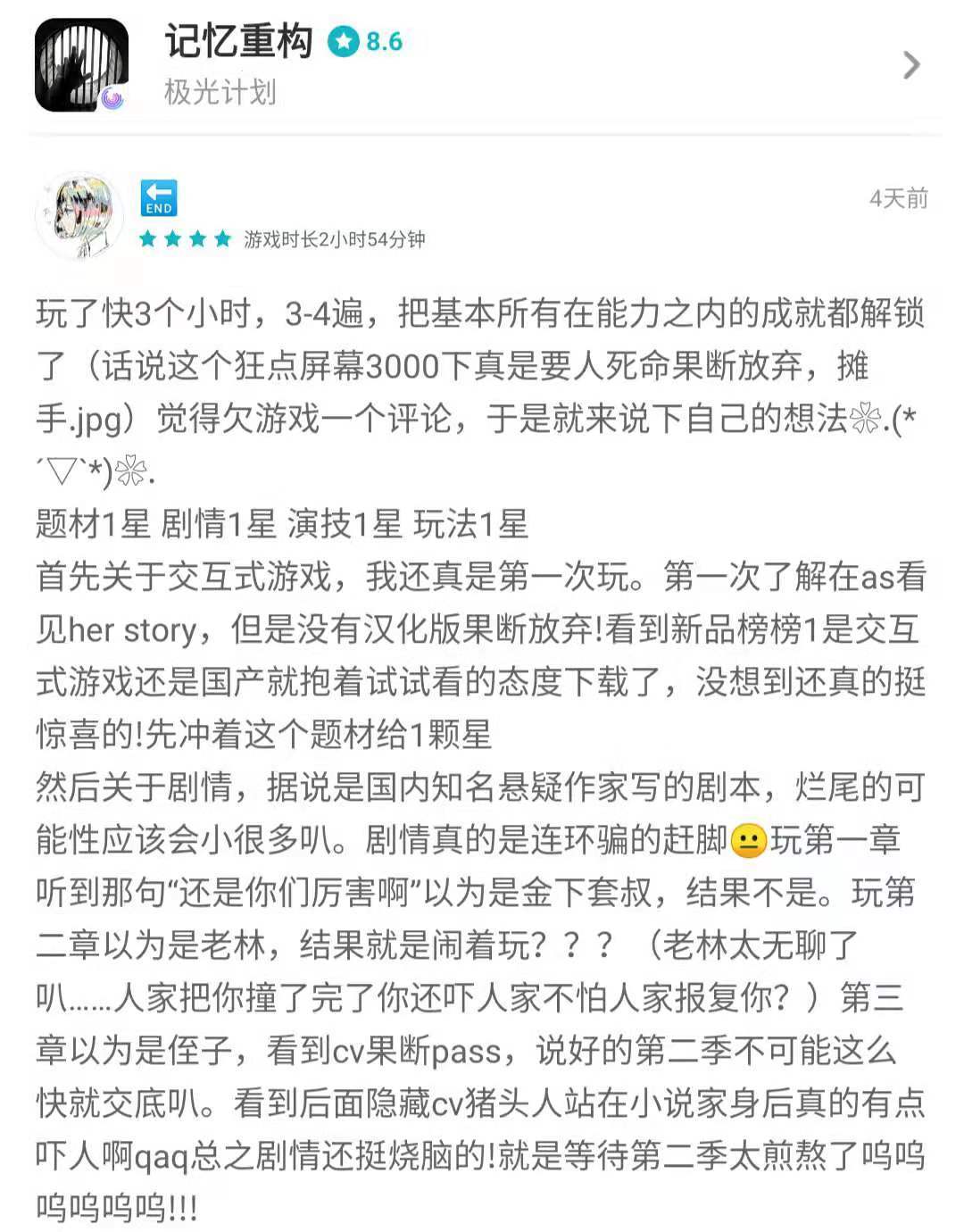 小管家希望下次Taper们发布诸如此类带有剧透成分的评价时能在开头带上例如【剧透警告】“以下含有剧透内容”之类的提醒,保护一下其他尚在游戏进程中的玩家的体验。