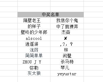 公布一下本期中奖名单: