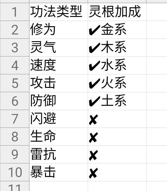 五行灵根每一系对应一种功法进行加成,升级后需要重新登陆游戏才会生效!对应关系如下表: