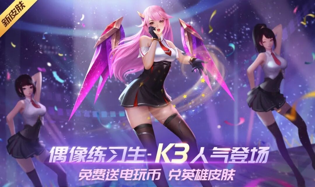 1. 新皮肤兑换:4月1日-4月14日,新皮肤【偶像练习生-K3】人气登场,用电玩币可兑换全新稀有皮肤【偶像练习生-K3】及头像等奖励,活动产出大量电玩币,有几率免费拿皮肤哦。