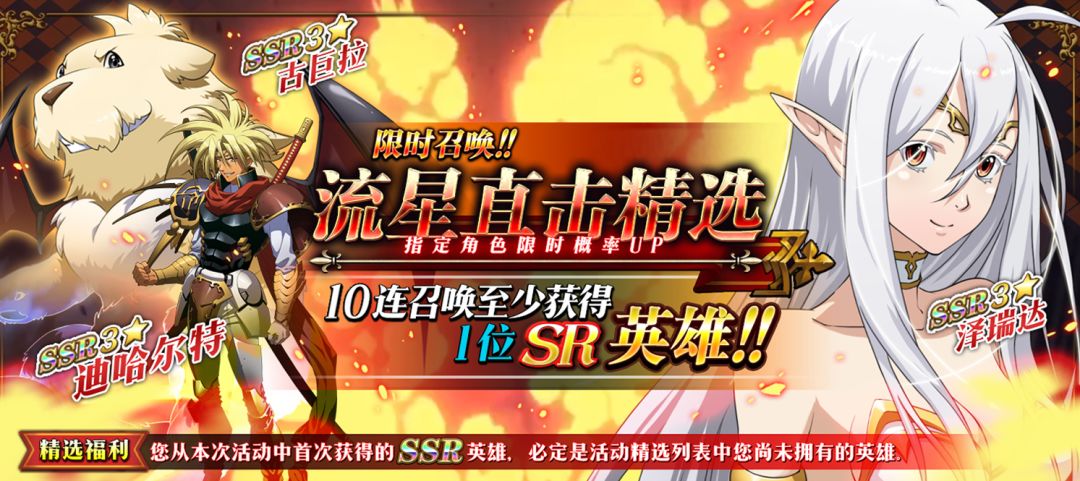 限时召唤[流星直击精选]中SSR英雄泽瑞达、古巨拉、迪哈尔特出现概率提升!