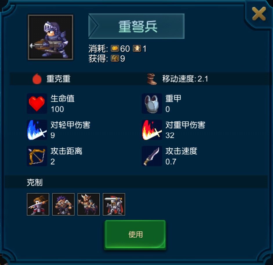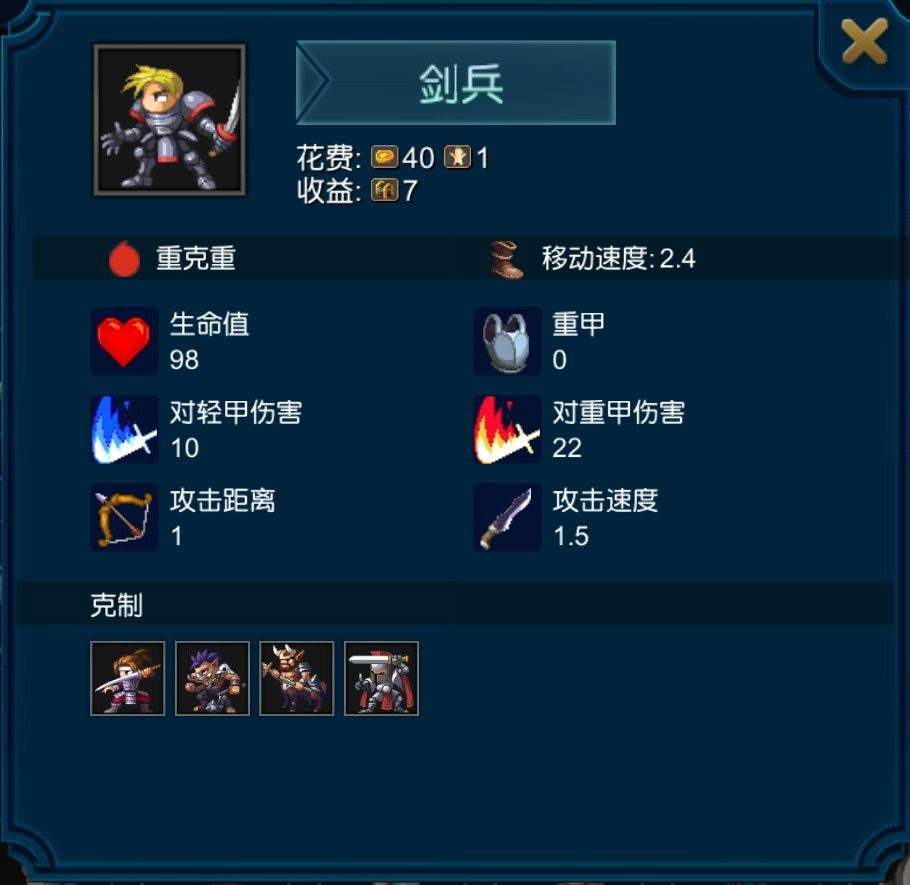 重甲剑兵:中后期的最强肉盾,不过前期没法用,这个单位是汐音玩家大敌,它是唯一一个金卡汐音都镖不死的一阶单位,而且价格比较合适,可以辅助你中期的卡兵,手感会比较舒服,而这个阶段正好是大多数汐音玩家丢飞镖的时间,这个单位可以很好的让你在汐音的飞镖之下幸存,当然了,输出低的令人发指,纯属肉盾,虽然技能可以反弹远程伤害但并不适合打远程,因为自身的输出实在太丢人,但是可以把重弩兵恶心一下,鲁/格对其进行加成,效果是加21点血,可以把血量加到191点,加上它还有一点护甲,可以说鲁/格的重甲剑兵有着与二阶兵媲美的血量护甲,是相当能抗揍的肉盾单位。