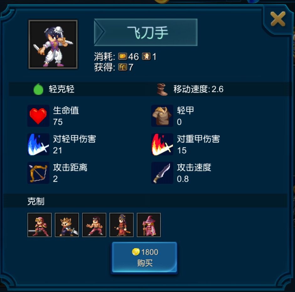 飞刀手:远程轻克轻单位,不出意外的话和重弩可以打配合,左慈对其进行加成,攻速+12%到0.9。(远程特殊,属性不做计算)