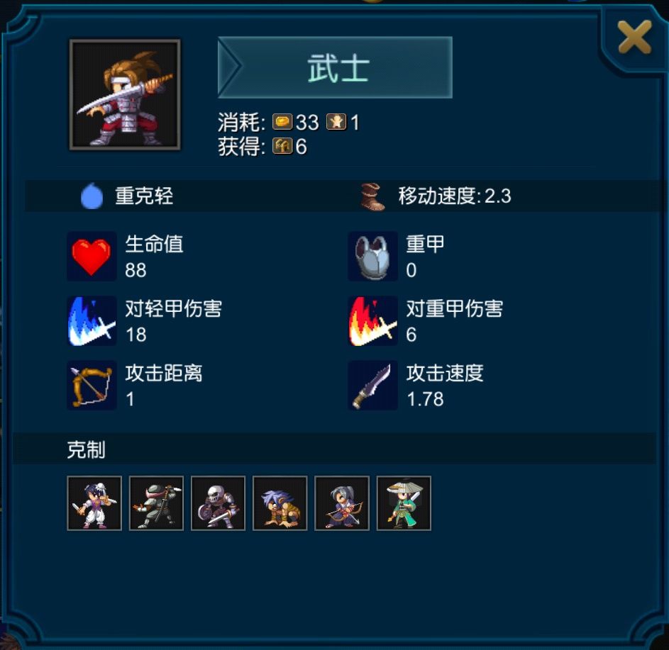 武士:较经济的单位,可以用来快速打掉新兵前期推进,也可以对抗对方的早期快攻轻甲单位,但是对重甲比较无力,所以很害怕剑兵或者重甲兵中混杂老兵之类的轻克重以及难以对抗躲在重甲后面输出的汐音忍者,源氏对其进行加成,效果是攻击速度增加12%,可以把速度加成到1.99,还是比较有意义的,想玩套路的朋友可以做它的铭文,另外源氏玩家可以玩一两个长枪兵和武士配合的枪武士阵,非源氏玩家玩也行不过效果一般。