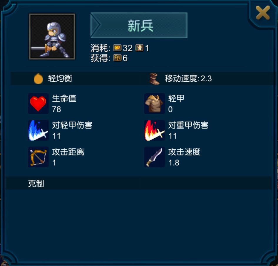 新兵:最经济单位,高攻速低伤害的典型,血最少的单位,所以在经济和控线方面有巨大的作用,属于高端局必备单位,哪怕是中后期的控线也对其有需求,而在超前期的比拼中则基本上都是以新兵为主体的控线能力比拼,另外,它可以一定程度上的对抗对方一阶的轻克重,重克重单位,既省钱又好用,可以掺杂在大多数一阶阵里来增加收益同时扩充兵团人数包围对方,英雄原石对其进行加成,加成效果是对轻攻击+2,把它变成伪克轻单位,能够在前期取得比较好的经济优势,但是也同时会带来前期控线难度变大的问题,所以只有大佬能玩好英雄原石,该单位基本无铭文需求,确实有新兵铭文套路的线,但说实话意义实在太小我不想叙述,有做新兵铭文的星尘你还不如做点别的单位的价值更高(一阶兵的铭文需求都比较小,但是对于想玩套路的玩家来说有需求)。