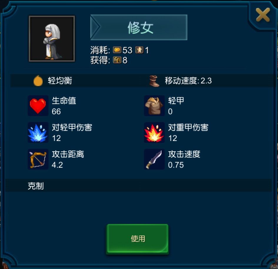 修女:2v2才有用的一个单位,1v1基本无需求,不过极少数妮娜大佬可以用这个去套路一下,打那种没有混足够克轻单位的阵,2v2时可以在少量近战单位保护下形成大兵团给对手带来巨大的劣势,妮娜玩家对其进行加成,效果是攻速增加12%,提高到0.84,铭文需求是越高越好,不过笔者对远程兵种了解有限,玩法自寻吧。