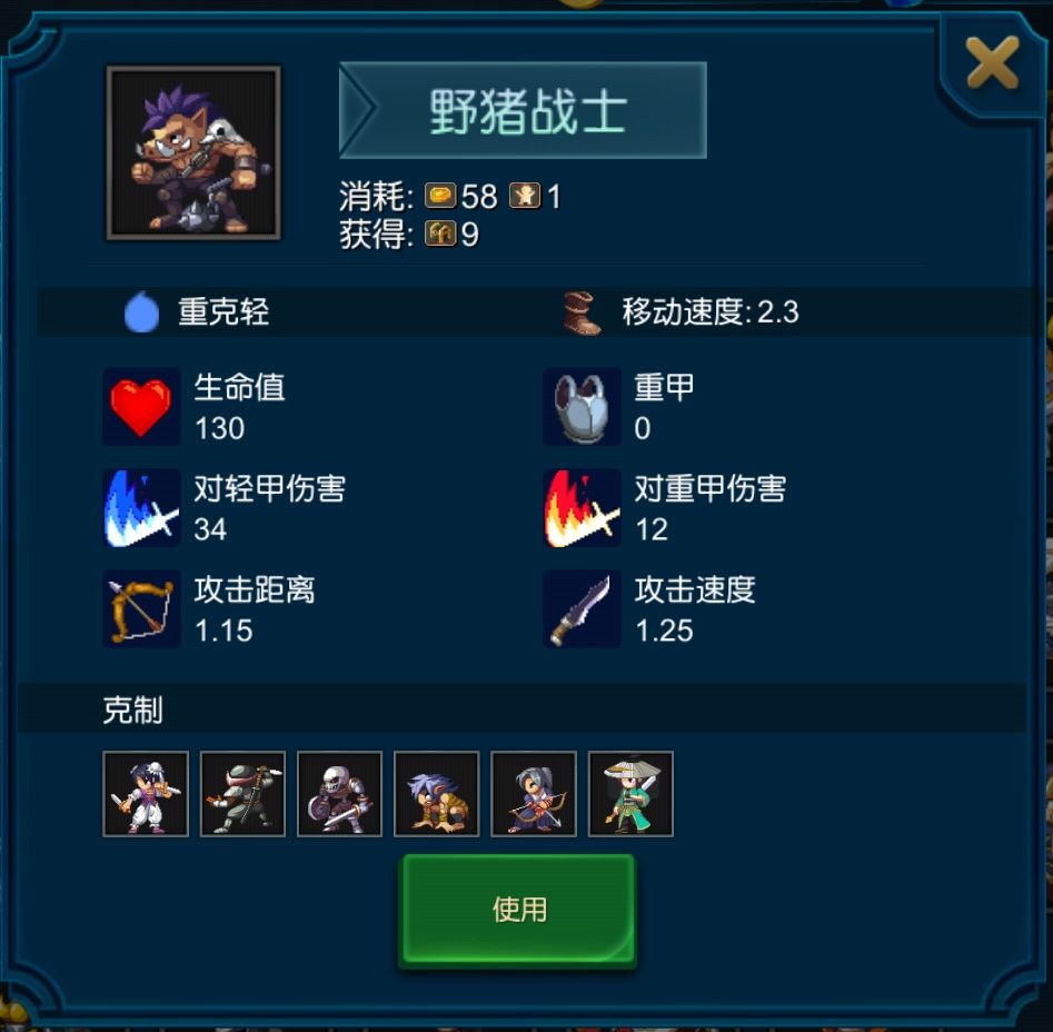 野猪战士:一个克轻比较强势同时比较有身板有肉的单位,而且经济相对来说也比较好,它的经济成长有些前移,所以中前期出它会比较容易建立经济优势,加之它手比较长,除了汐音忍者,它是手最长的一阶近战兵,加上血量还凑合,是有一丁点肉盾的效果的,但有点怕重克重单位,是个半肉半输出的克轻单位,比较强势,凯撒(老虎)对其进行加成,效果是攻速增加12%,把攻速提高到1.4,铭文需求一般。