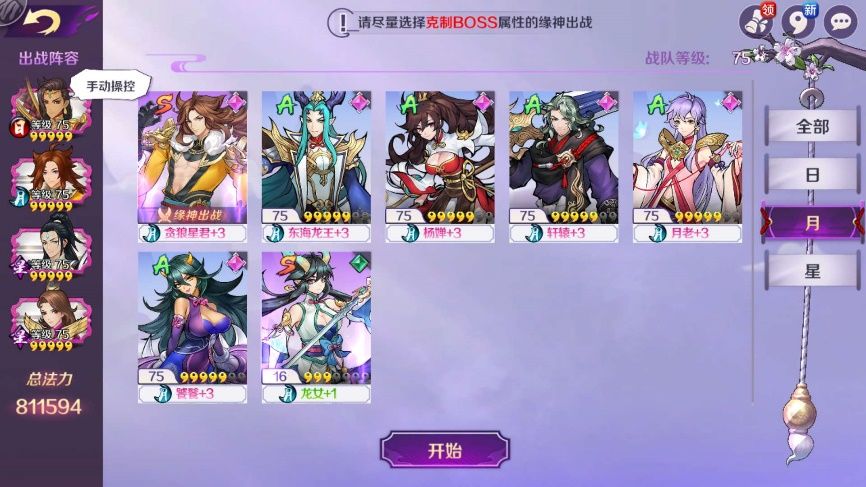 在每场战斗中,仙友们可以上阵4名缘神,并且对1名缘神进行操控。为了让游戏更富有策略性,阿鼻地狱按照日、月、星的顺序出现守关缘神,而选择克制其日月星属性的缘神,将让通关变得更加简单喔~