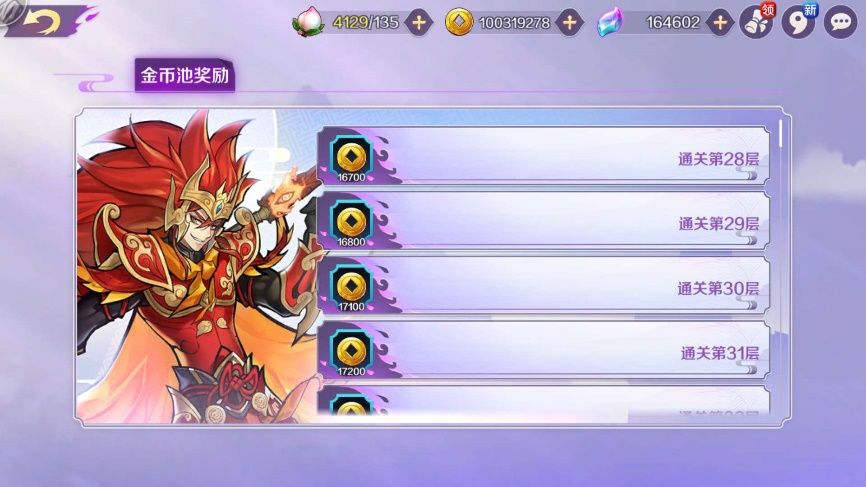 仙友们战胜守关缘神后,不但可以获得丰厚的金币奖励,还可获得其他培养资源和宝箱等奖励,而且根据闯过层数的不同、获得的奖励也不相同。此外,为了避免仙友们重复闯关的枯燥感以及有更多的时间去体验游戏内的其他玩法,仙友们通关15层后即可一键领取奖励。