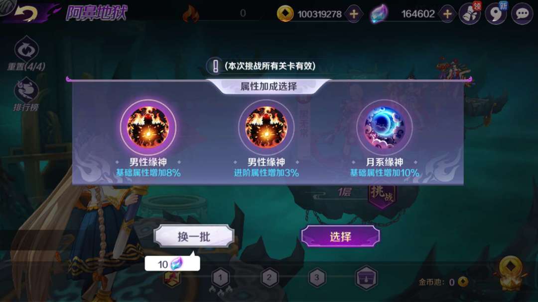 相信仙友们都有自己培养缘神的偏重,而不同层数的阿鼻地狱BOSS基础属性也不尽相同。每次开局我们都会提供日、月、星、男性和女性5种类型的BUFF选择,以保证仙友们能够更有效地发挥缘神培养的属性。