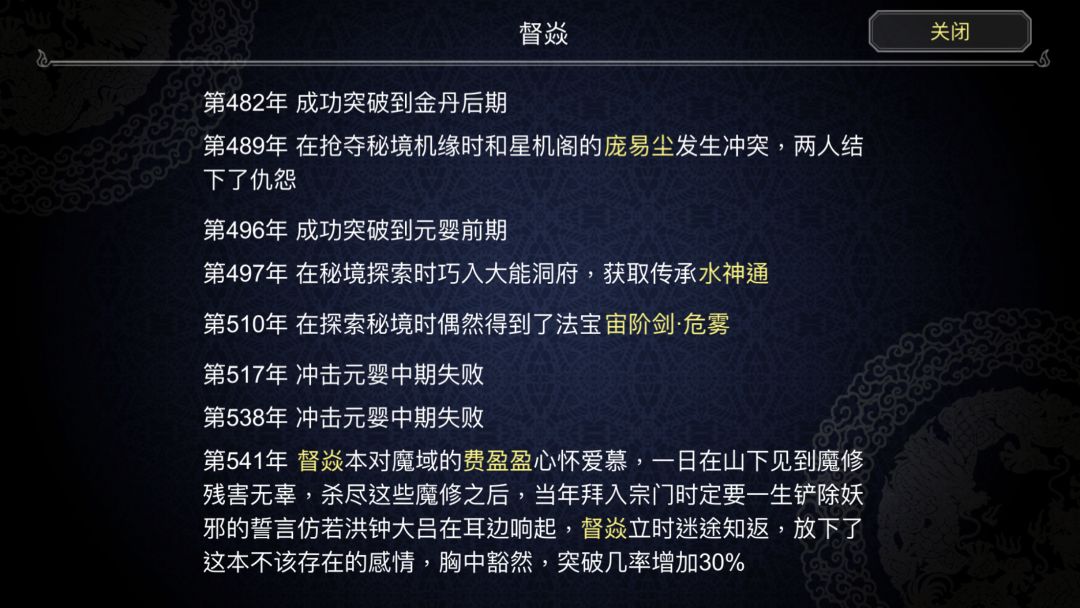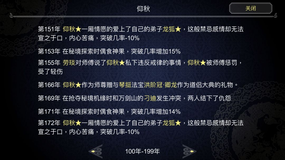 至于掌门(掌门的境界必须要比绝大多数弟子高,不然掌门会不断的被别的弟子瞧不起(负面事情会很多,很烦),八面玲珑会好一些),我的建议是掌门的神通是加武力的,又或者掌门有天生剑骨,又或是龙凤之主,给掌门配的法宝基本上要加武力(修炼速度不用太快,在当下版本里面掌门就是资源的榨汁机,以及保护宗门的职责,所以拼命的给武力法宝,修炼速度可以稍微压一压,牺牲一人为了宗门)到了游戏后期一旦有大乘中后期的魔修为了讨伴侣打上门来(这种事情基本没法避免,我一、二周目都遇到过),如果掌门的实力不济,很容易会陨落(我一周目的掌门就是这么没的,怎么退存档都救不过来,哭)二周目的掌门是个气运之子,实在舍不得,愣是靠着我攒了2000年(就丹鼎峰那30 个弟子)练的还春丹救了回来。这件事情告诉我们,1800年以后,掌门就不要随意刷副本了,攒着那点武力镇守宗门吧,不然怎么死的都不知道。