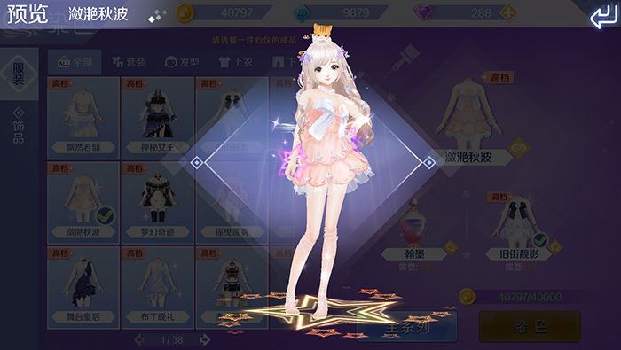 服饰染色可以相互转换,点击服饰下方的全系列可以查看整套服饰,染色服饰也可以被重新染色回来。这里比如这套旧街靓影套装,我们可以通过染色道具翰墨来染色粉色,点击服饰后可以看到试穿后的效果。