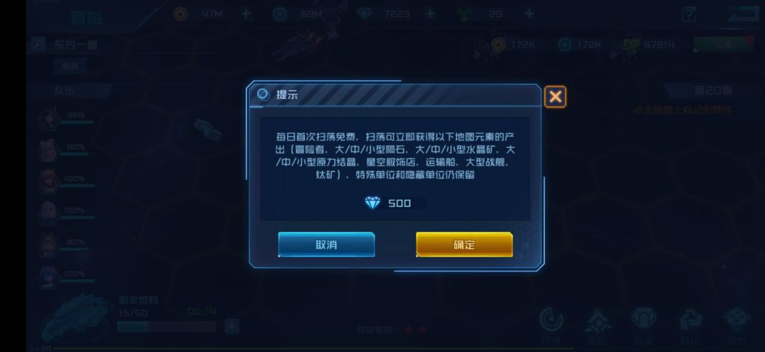 移动时尽量更多的经过红区和黄区,他们的资源收益更大,并且有概率碰到海盗和军阀。油箱价格昂贵不要乱用,它的作用是在你不得不因为现实生活事情长期中断游戏进程时提前结束本图探索并重置地图。比如你已经大体探索完了冒险地图最后还差三格就能够到重要的高级资源,但是没有油了,此时你马上就要上班了并且后面4个小时都不能碰手机,这时需要使用一桶油吃掉目标并且重置地图然后安心上班。
