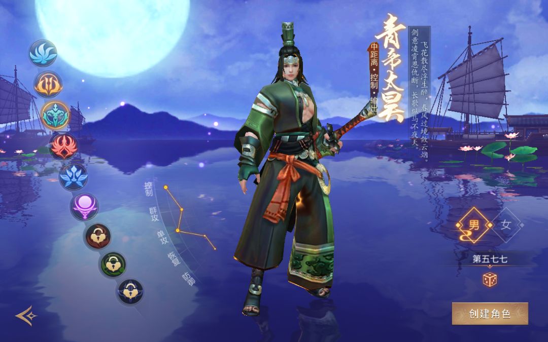 青帝太昊属于中远距离输出角色,绿色的剑气与其纵横盛唐江湖,手持宝剑打出落叶纷飞之势,一剑封喉。青帝太昊技能主要以爆发伤害为主,中远程输出凌冽剑气,在战斗中先手3技能有几率配合被动技能打出定身效果,随后接4技能也有一定几率爆发3倍伤害,让其在战斗中先声夺人。