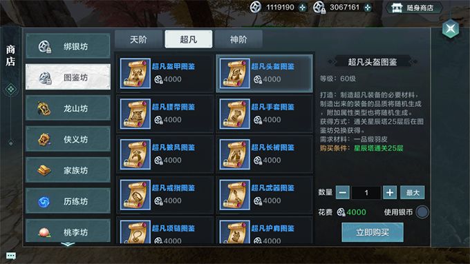 打造装备非常简单,必备三样东西:装备图鉴、指定装备的材料和绑银。其中,绑银可以忽略不计,比较重要的是装备图鉴和指定装备的材料。每件装备的图鉴都不一样,需要花费绑银在【图鉴坊】购买,需要注意的是,购买时对于星辰塔通关的楼层也有要求,必须通关相应楼层的星辰塔才能购买图鉴,装备等级越高的图鉴所要求的层数也越高。装备材料也有3种,专门打造头盔、护肩、衣服和裤子的缎羽皮;打造武器、手套、鞋子、披风的流云铁和打造腰带、项链、戒指和护符的云绸砂,根据打造的装备等级不同,消耗不同数量的材料,比如打造天阶装备每次消耗6份材料,超凡装备每次消耗12份材料。
