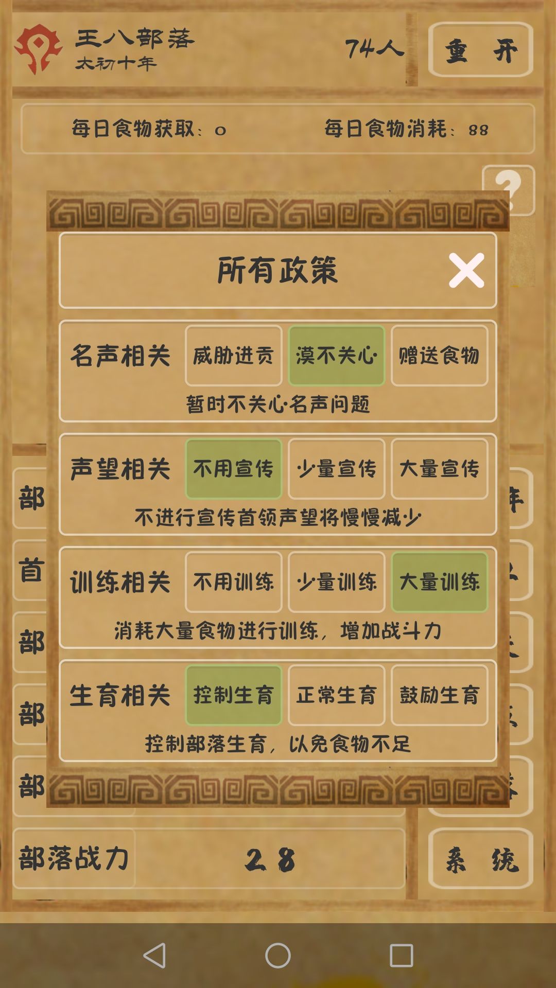 首先你要战斗力,所以你要把政策调到大量训练,其余调到最低,如果你想娶老婆就首领声望调到中间