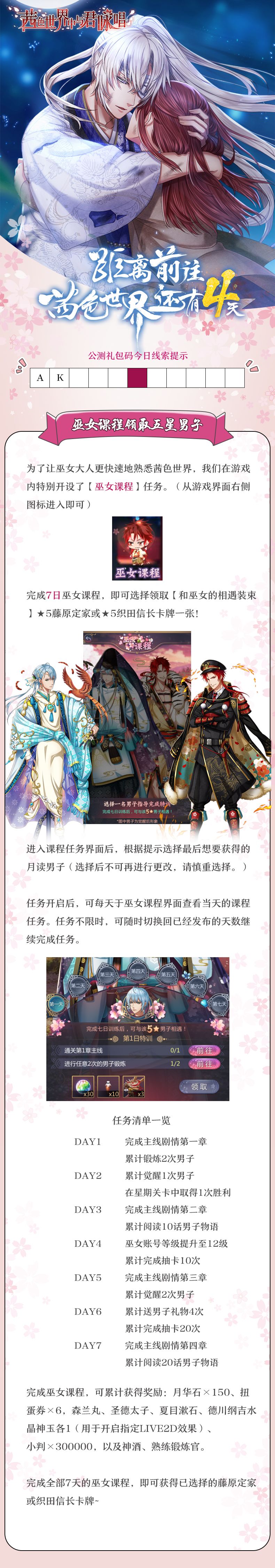 累计完成7日份的所有巫女课程,就可以领取指定的【和巫女的相遇】装束★5藤原定家(CV:樱井孝宏)或★5织田信长(CV:中井和哉)卡牌一张