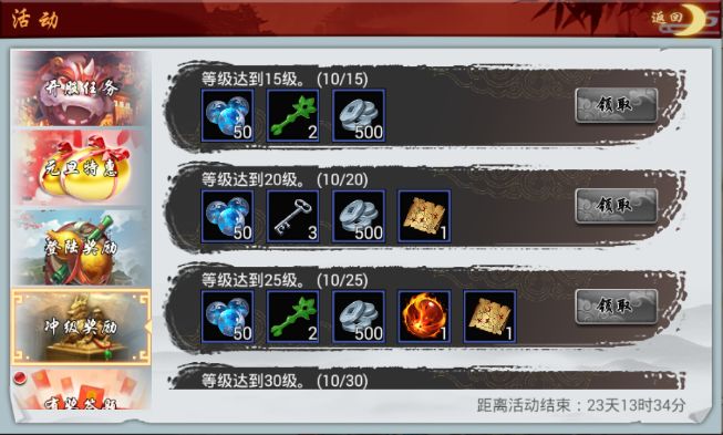 冲级奖励:这个就很简单啦,只要玩家等级每过5级就可以到这里来领取等级奖励包啦。这里的奖励可是很多的,不仅有钱币内丹之类的道具,还有紫卡跟橙卡哟~