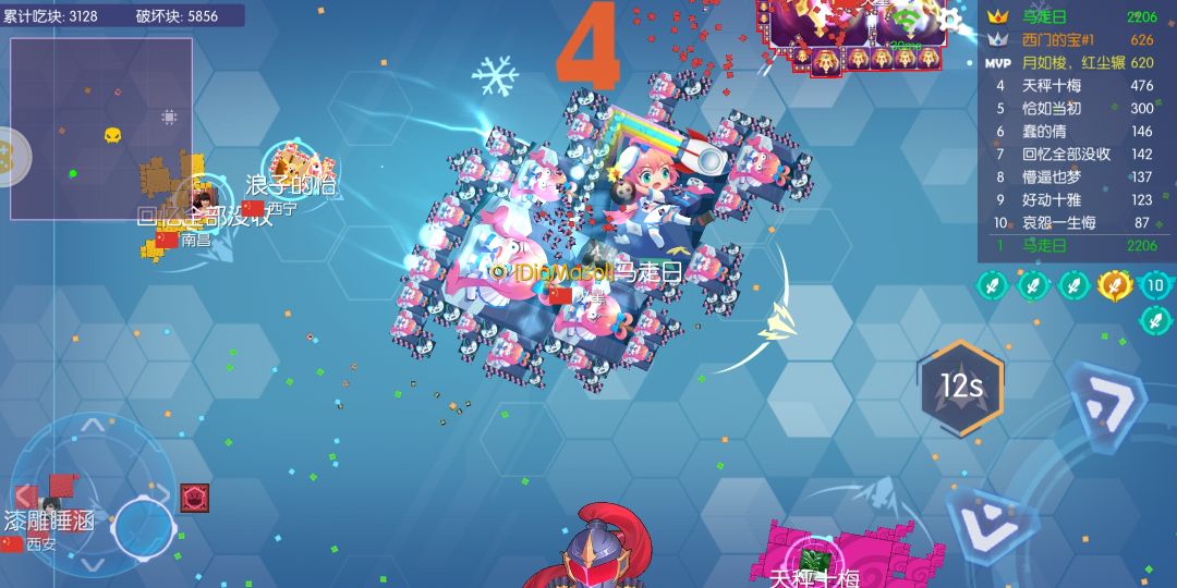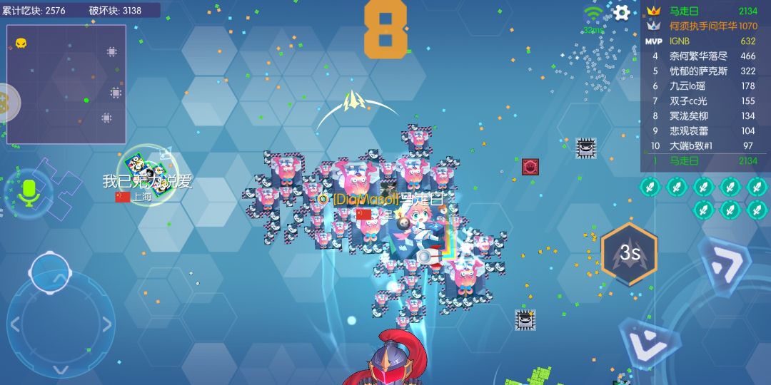 • 再说一下,自身长度一般速度很慢但有超大块贴身的情况,遇到和自己最大块差不多大的敌人时,可以开了技能直接对撞,大块相撞会碎裂但近端会生成两个小块,并且大块周围包裹着的小渣渣也会支撑起阿肯技能的直径,做到击杀或损耗对手。对拼之后的一地战果(渣渣)怎么支配下边有说。