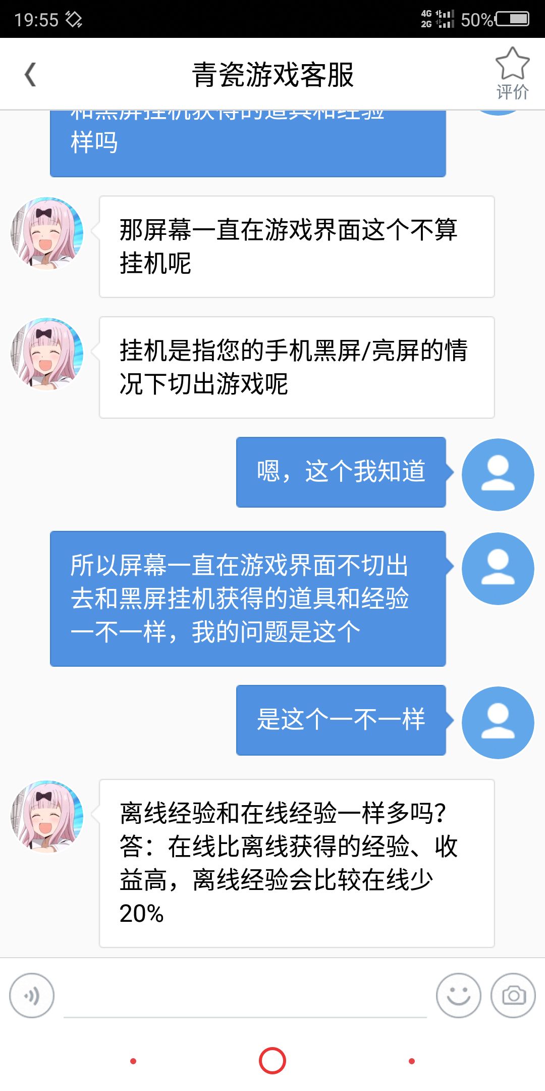 这是我之前与客服的对话可以看到晚上手机亮屏是比关屏挂机多百分之20的经验的,所以有条件的玩家可以亮屏睡觉,设置显示界面可以对亮屏时间进行修改。打这么多字不容易,给个赞吧有问题可以在下面提问看到的话我会及时回复。