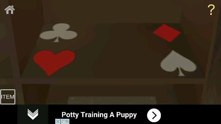 【自转】攻略 首先先去拿做第一个小沙发上的眼镜(要点近了才能看见),再后退右转去玻璃桌右边椅子那拿硬币,然后去电脑桌那点右边抽屉点到352(点到了自然就会停住),拿到电池,给玻璃桌上的盒子使用电池输入352,得蓝钥匙并发现爱心3,再后退右转去蓝锁柜门使用打开得到铁块和硬币,并发现草花4。 去沙发那给立着的黑盒子放上铁块再点眼镜看发现密码1495,后退,注意小沙发与长沙发之间的墙角提示紫→(绿)粉。后退再去蓝锁柜子那输入密码,拿到铅笔并看到方块1和黑桃1。去对电脑桌上的纸使用得如图1