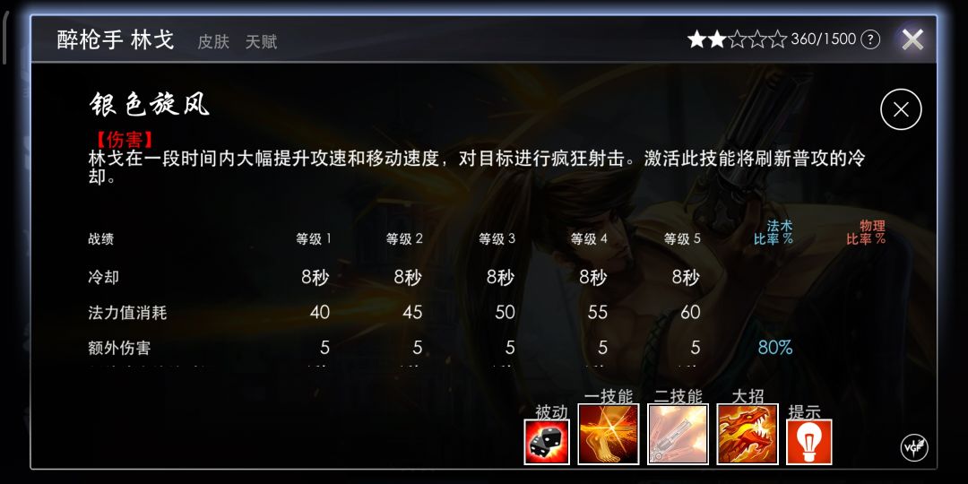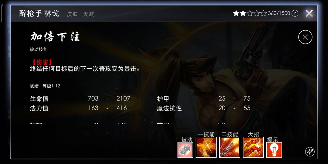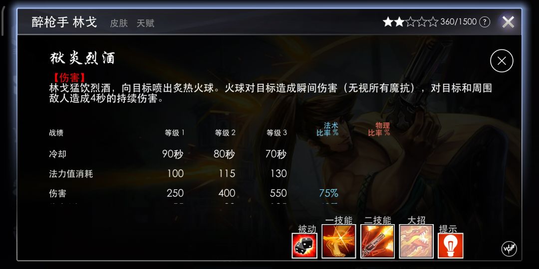 一技能主要用来减速,追击敌人的时候可以使用粘人力比较强。一技能的连招是a1a快速爆发,推荐有被动的情况下A1A伤害非常可观。(酒枪常规连招)