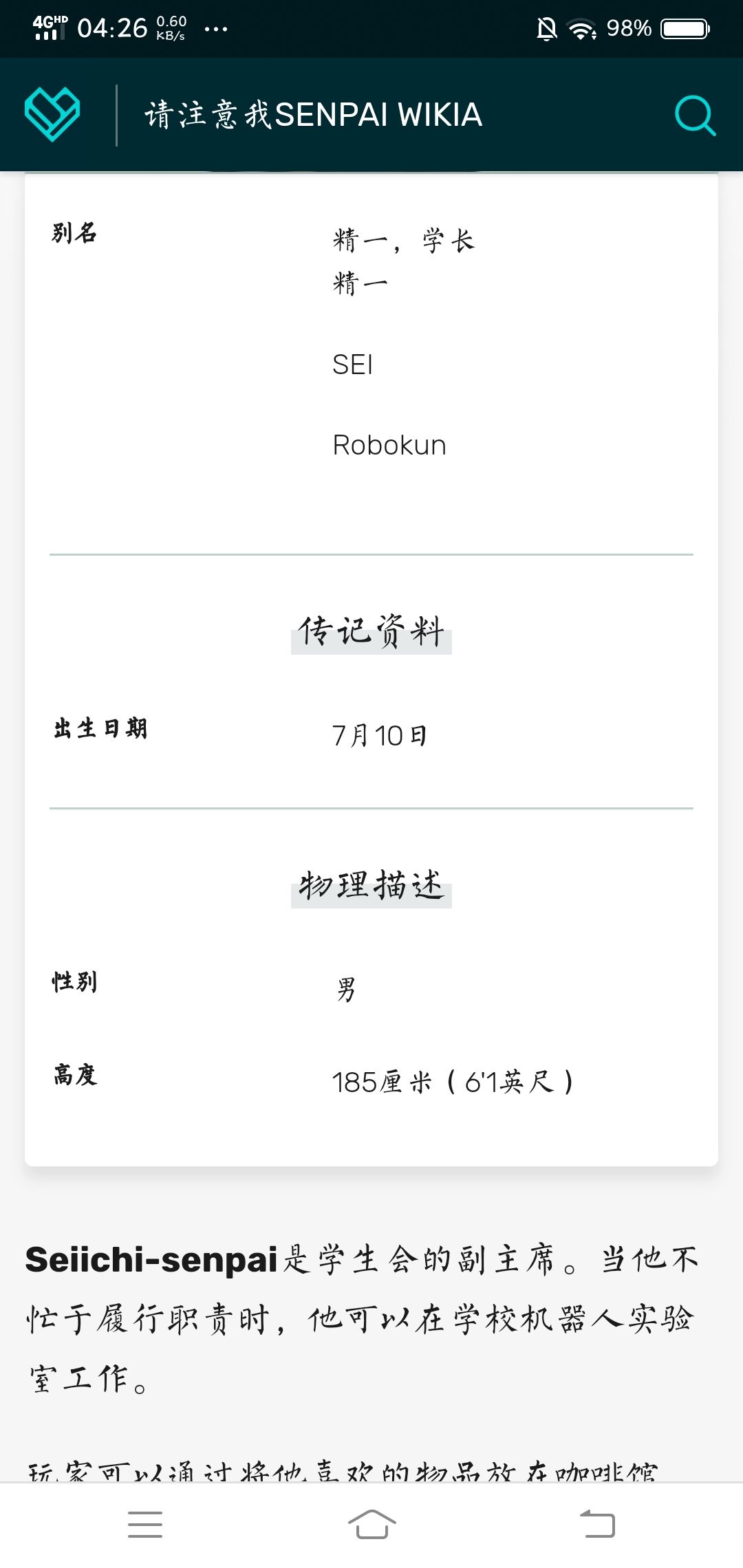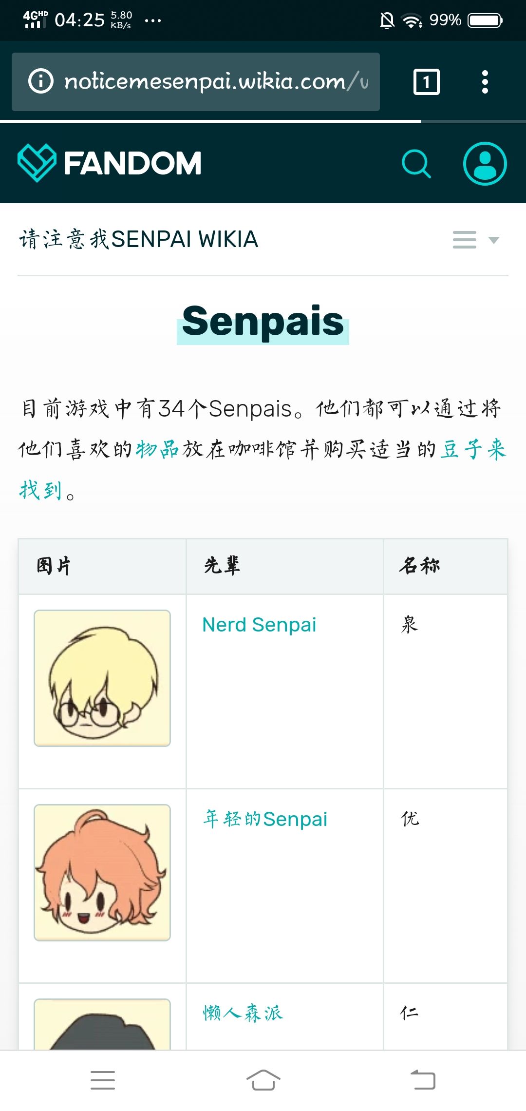 我发现这个网页上收集了全部senpai的各种资料(包括游戏里没有的介绍)。网页是英文版的(我用了chrome的网页翻译。机翻,有些地方会有一些别扭。)