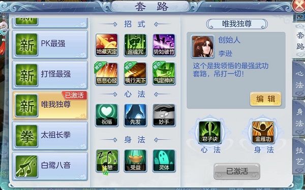 《盖世豪侠》手游竭尽全力还原最真实的武侠世界,提供了上百种主动和被动技能招式。玩家达到指定等级后,可以任意组合学习3个主动技能和3个被动技能,形成一套你的专属武功套路。你还能为你的武功套路起一个响亮的名字,真正做到开宗立派,自成绝学。