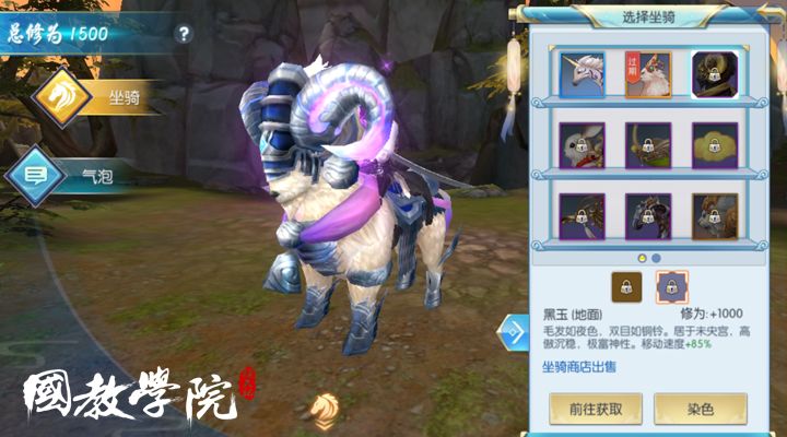 黑玉是一头强健有劲的黑羊,骑着这种黑羊奔驰的,必定是同样魁梧有劲的英豪。对于那些性情直爽豪迈的男性少侠而言,黑玉是非常好的选择。染色后的黑玉不再是一头黑羊,而是通身为白色,且带着银紫色装饰,对于一些温婉的女性玩家来说,小白羊带着一种天然的可爱,会是不错的坐骑选择。