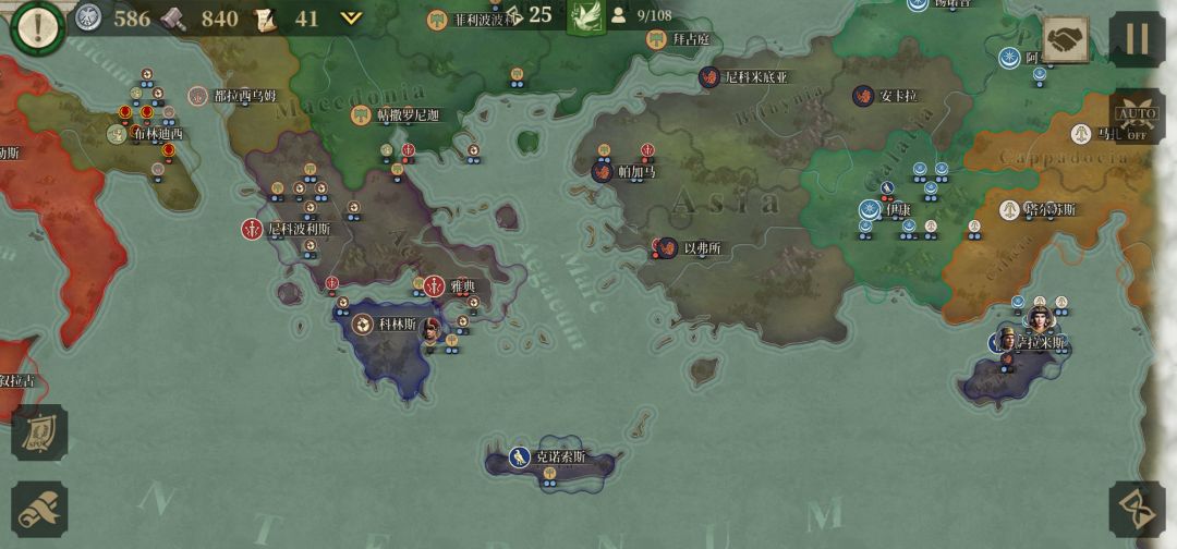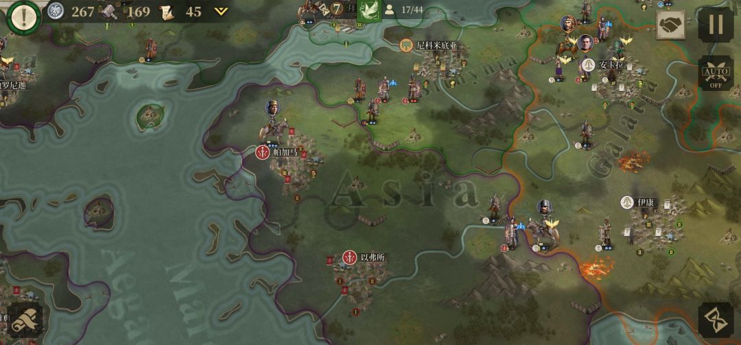 值得说的是本局征服并不太顺利.前期没有抢战小亚细亚敌军城池导致没有钱拉拢中立国两国近早参战使局势以及胜利回合大大延期