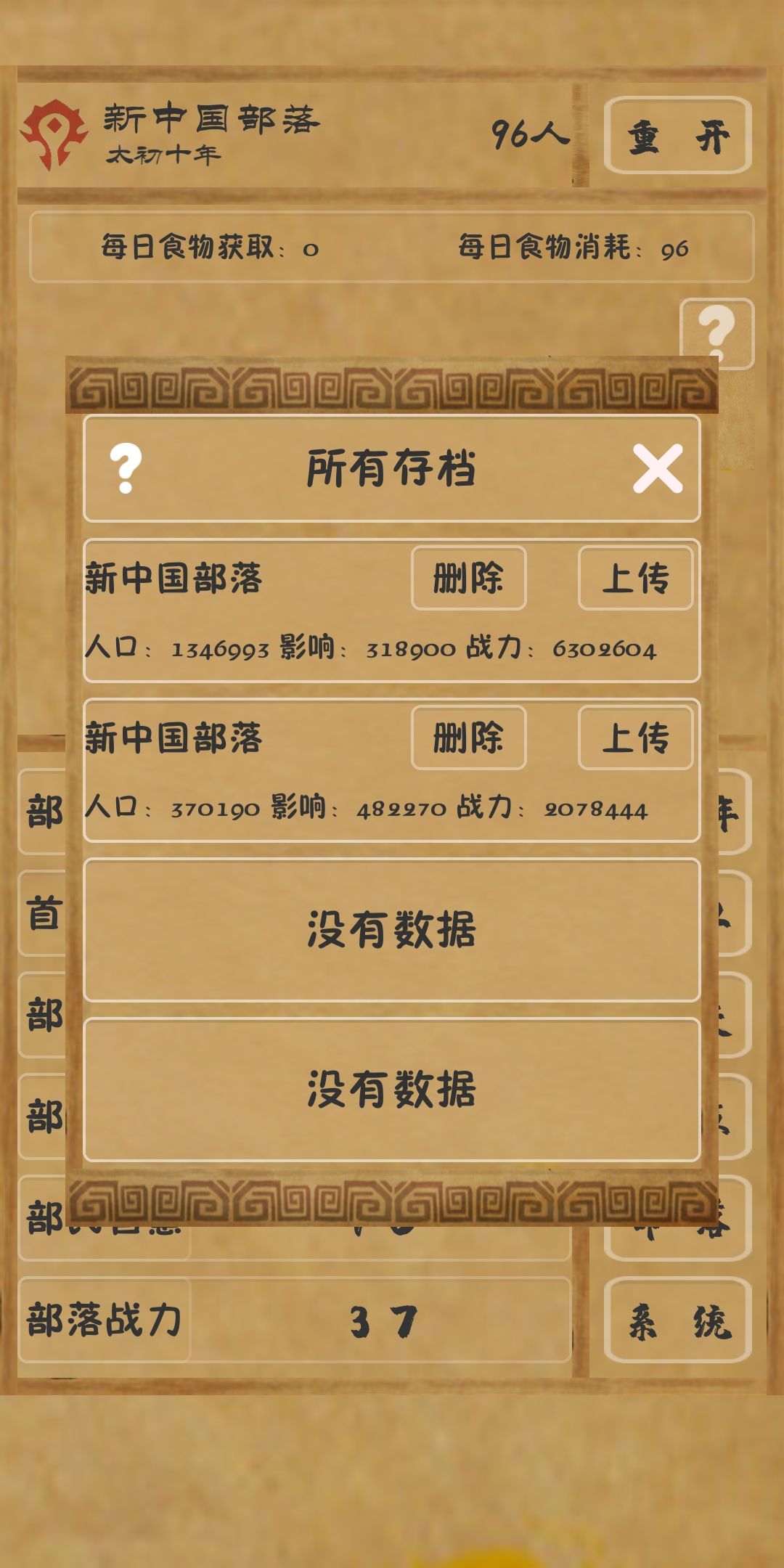 ③生育:高玩可以挑战第三个,我一百三十万的存档就是从这里开始一直暴人口,玩的有点心惊胆战,一般玩家可以点第二个,游刃有余,也不会太累。注意,生育和灭部落才是部落最重要的人口来源,而不是游民。