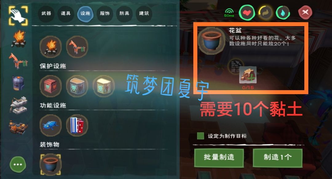 首先我们做一个花盆通过工作台制造 (需要30黏土)
