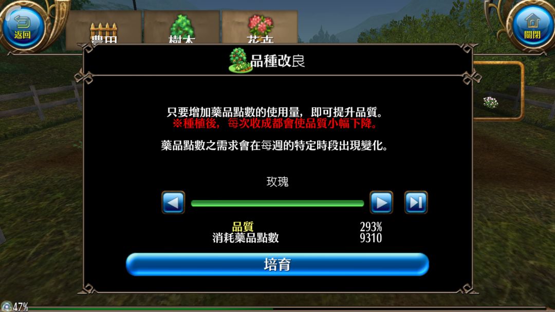 如图,点击菜园之后选择一种作物,就会出现以上的界面,大家可以看见我把那个条条拉满之后,不同的作物要求的药品pt数量是不同的,品质也是不同的,大家要做的就是找到最高品质的作物,然后种下去