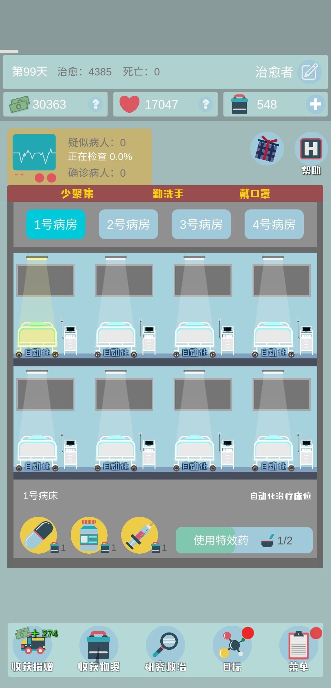 游戏中期那种手忙脚乱的感觉让我体会到了前线工作人员的不易,当医疗物资不够的时候也体会到了那种急切的心理,游戏一开始就想着不能有一个人死亡,一定要全都救好,最终也不负所望,感谢这场疫情奋斗在前线的医护人员,感谢你们的付出,中国是打不倒的