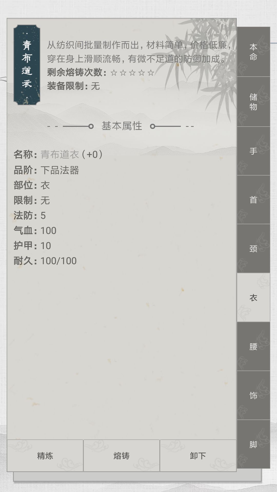 作为人物最主要的力量来源之一,一身良好的装备是外出历练的重要保障。游戏里的法宝分为九大类,其中储物是增加人物负重,还有一个本命法宝的类别,这个是很重要的一个部分,设定还在完善,暂时不透露。耐久决定了法宝的使用时间,如果没有修复耐久为0的法宝,法宝便无法为你提供增益,形同虚设。
