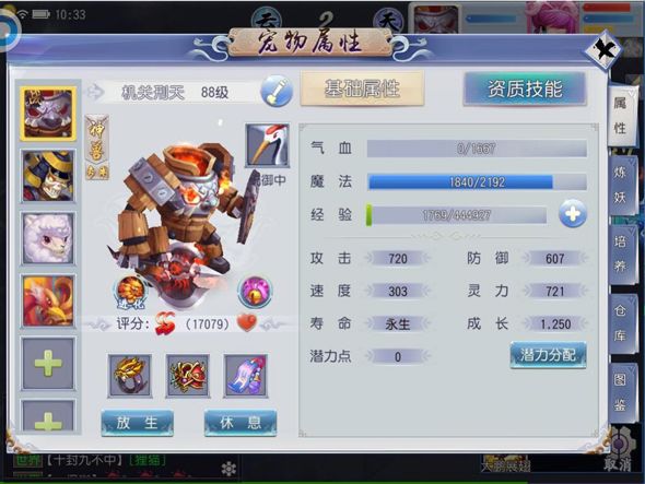 洗宠看的是宠物的资质以及技能,还有宠物的成长率。这里不过多介绍,当洗好一个满意的宠物之后就可以携带以及对它进行提升了。