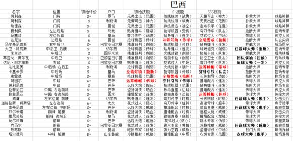 这是是巴西队大名单。应该看的很清楚,黑色加粗是队长和各种大师,红色加粗是BUFF技能。每个球队都应该具备3个BUFF且各种大师尽量不重复。