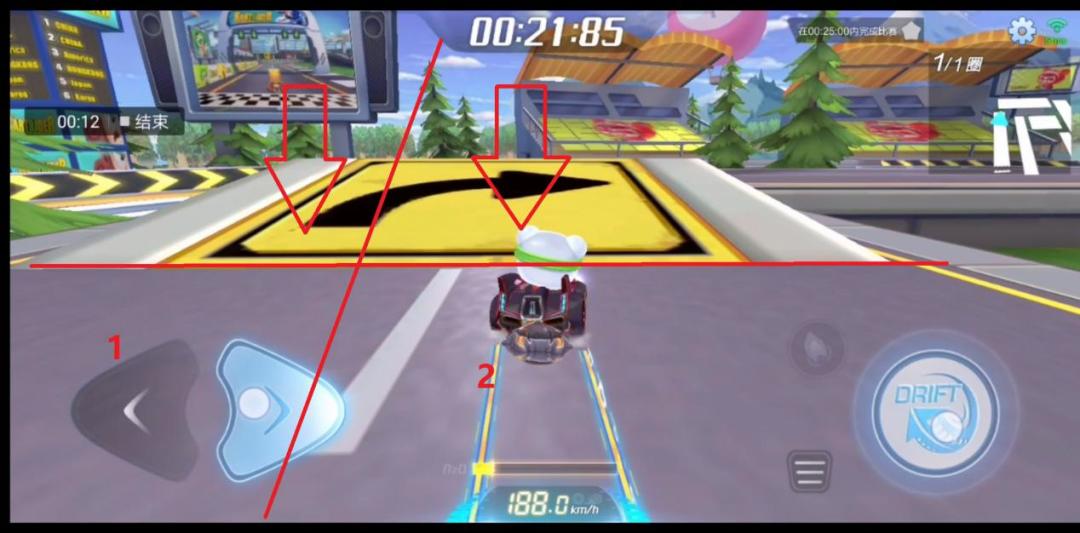赛道前半段要求不高,也没有什么特别的技巧,第一个腾空漂移的时候,不管你是选择了如下图的1道还是2道,只要在黄色踏板上正常使用漂移技能就可以安全着陆。