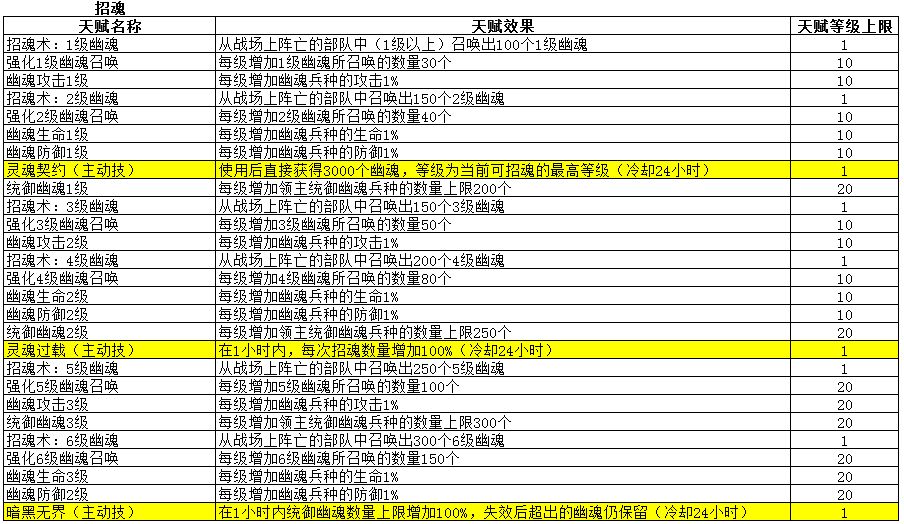 后期兵种等级7级后,可考虑重置天赋,这时候幽魂的作用开始减弱,可以慢慢舍弃幽魂,主加战斗或辅助天赋了
