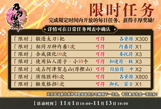 感谢各位审神者对《刀剑乱舞-ONLINE-》的支持,为了让审神者体验更多的游戏内容,获得更好的游戏体验,本周我们将于11月1日10:00开启全新活动。