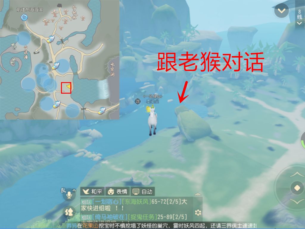 简介:我们来到花果山这个标注的位置可以看到一个坡。坡上有一只老猴,跟它进行对话即可触发奇遇【飞越水帘洞】(限时10分钟)。