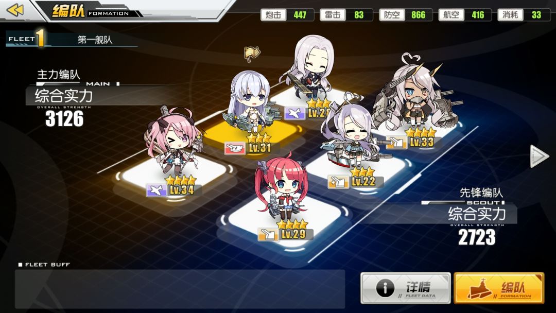 主力编队,各由三支舰船组成,先锋部队特定只能选择重巡级别以下的船(这也是玩家需要手动操作的舰队),主力编队由战列舰航母战列舰巡洋舰组成(主要为先锋编队提供炮击航空支持),这一设定较为合理,船尽其用,不会再出现什么6CV满天飞的请况了。玩家通过操控先锋部队,由ai自动开炮,躲避敌方的炮火弹幕,并对其进行火力打击,摧毁他们获得游戏胜利,值得一提的是,小小的战斗要考虑因素很多,所有包括船速,射击精度等都会影响战斗。