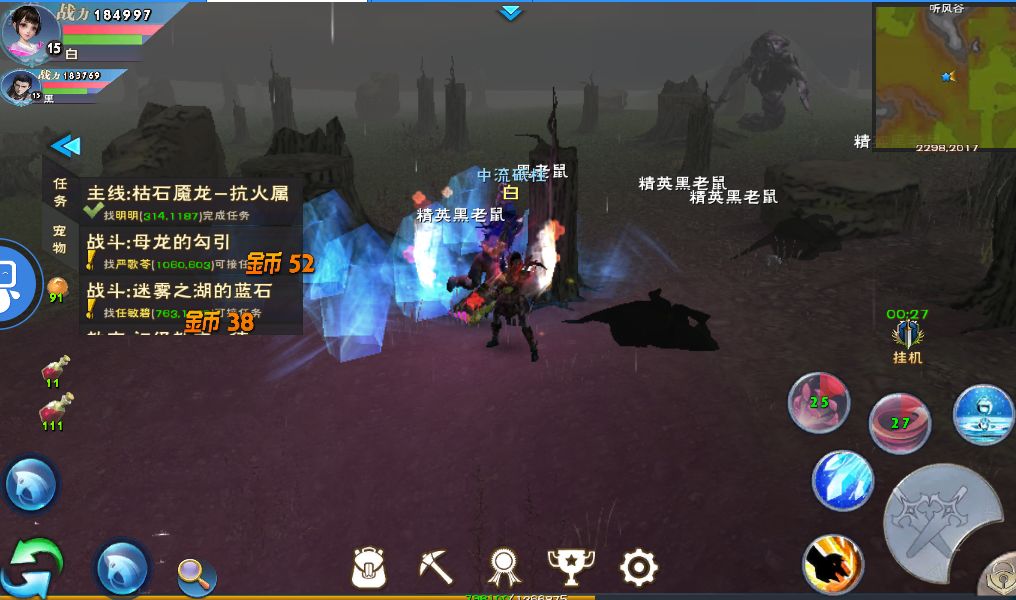 清主线的时候配合支线老将任务一起做,事半功倍。第一天剩下的时间可以去刷老鼠打低阶强化石和低阶打造石,坐标(2300,2022),也可以去风间地打幼鳄兽刷肉,坐标(2171,1702)。初期缺金币缺强化缺打造石,必须刷这三样,为第二天升级打好基础。24小时内能到16级就行,其余时间都拿去刷。用模拟器的可以写个简单的打怪脚本,用安卓手机的可以用自动精灵写脚本挂机,脚本比手动都快。