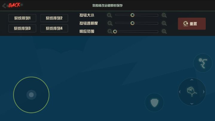 自定义布局中可以设置四个基本功能键的按钮大小,按钮透明度以及响应范围。系统提供4种排列方案,玩家可以保存4种常用的不同排列方案,以便之后快速切换。