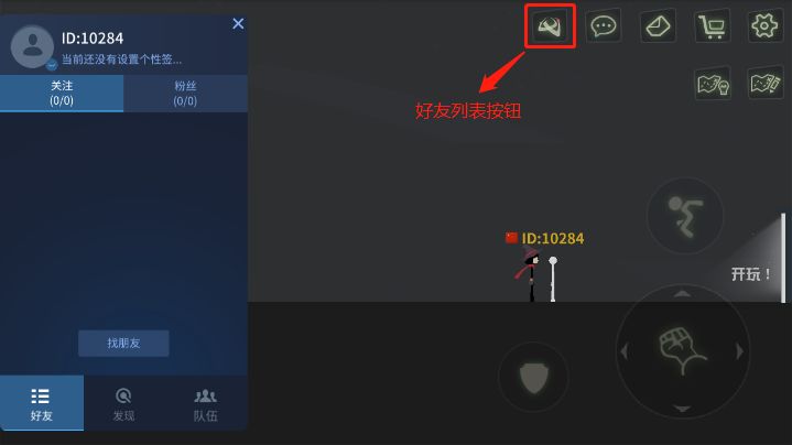好友列表按钮,即可以显示你关注的好友以及关注你的粉丝,组队列表也在此。