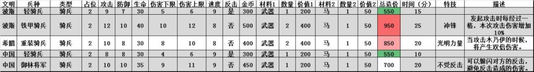 一直觉得中国的这个轻骑兵有点定位不准,属性稍稍弱于波斯轻骑兵,同样没有特殊技能,同样的造价,除了训练的更快,完全就是个重复的军事单位。其实开发方可以考虑把这个轻骑兵的角色替换成更具中国特色的远程兵种,比如:火箭兵。