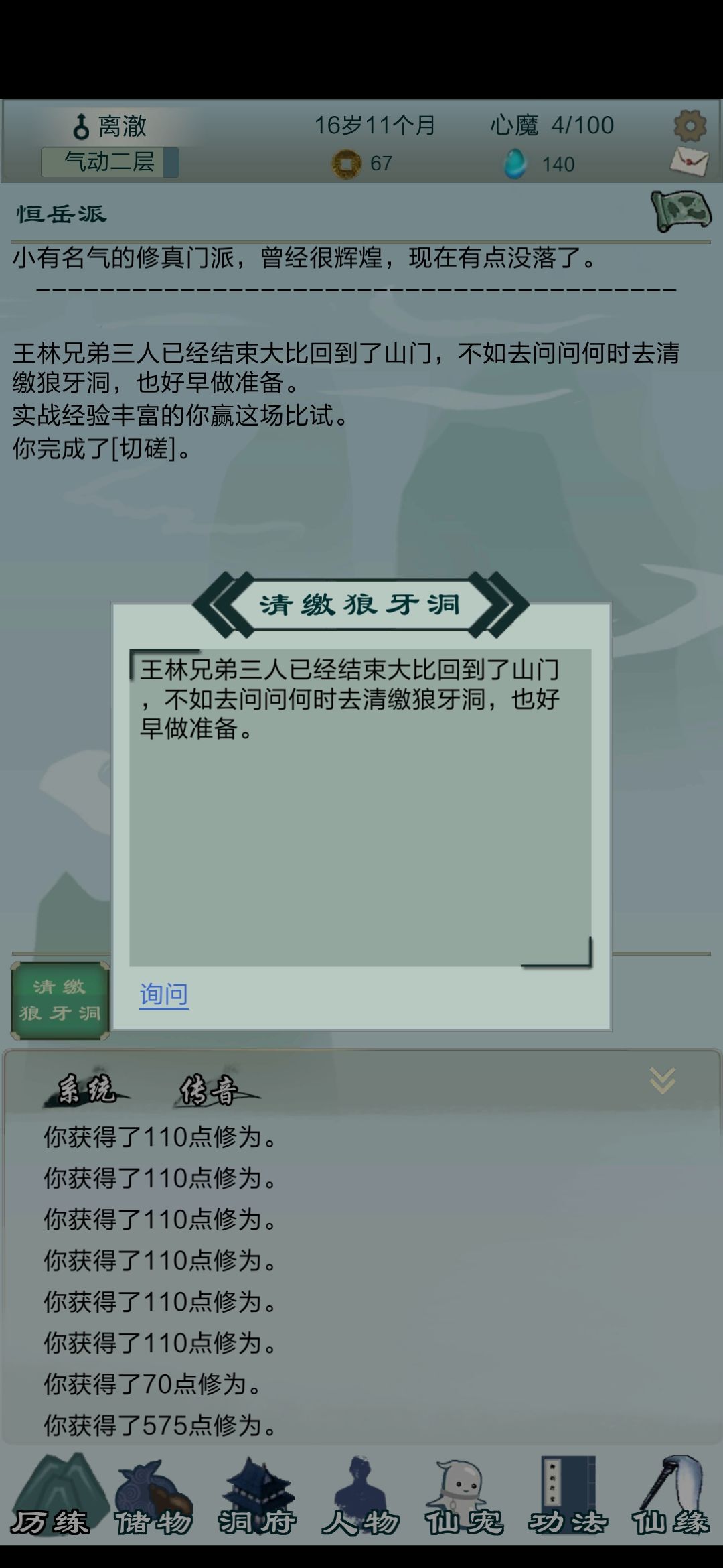 在恒岳派做完门派大比之后往后继续开图 大约四小时左右回到恒岳地图继续挂会出一个清剿狼牙山任务做完之后在